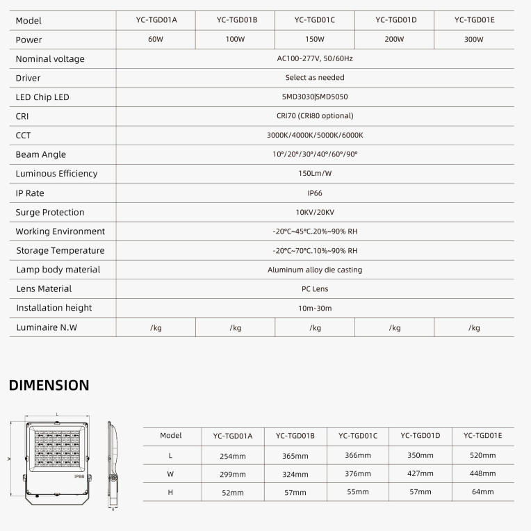 | YC-TGD01-50W | 358*294*52 | 50w | Heat sink Aluminum body,Glass,Bracket,304 screws, PCB, เลนส์ |